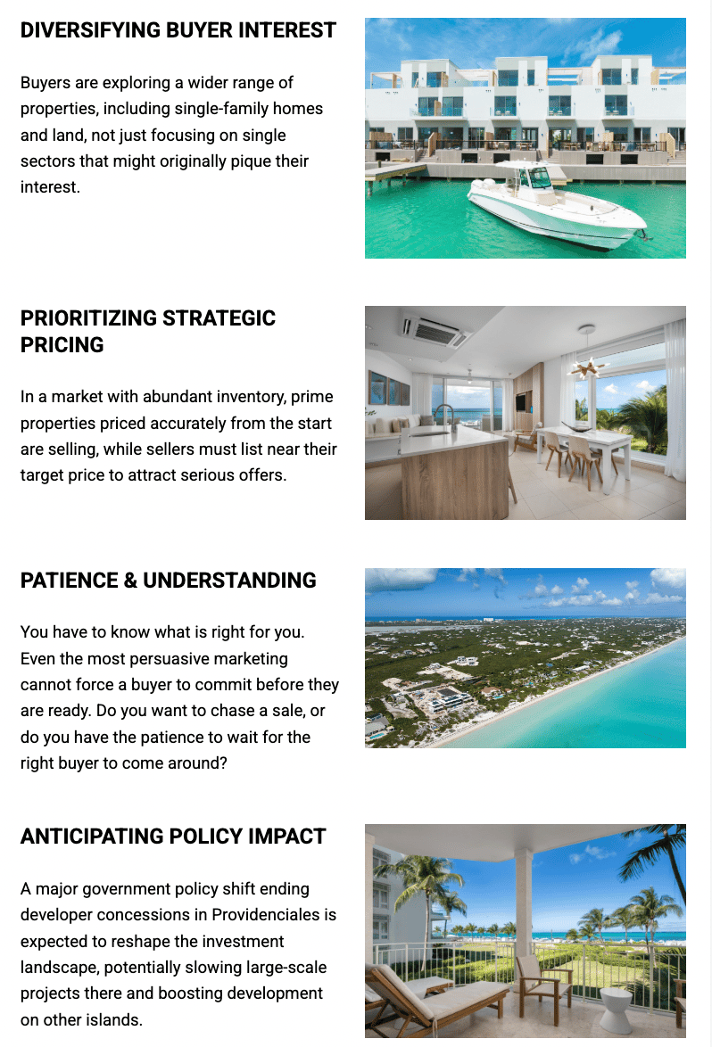 This policy shift is intended to manage the strain on infrastructure in Providenciales and redirect development incentives toward the family islands. The full impact of this change remains to be seen. It could reshape the investment landscape, potentially slowing the pace of large-scale projects on Providenciales while creating new, exciting opportunities for growth on other islands. For investors and buyers, this is a development to watch closely as it will undoubtedly influence market dynamics in the months and years to come.
